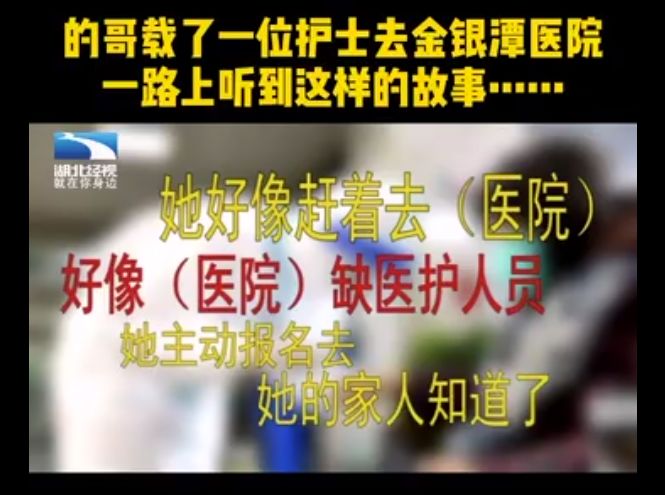 疫情爆发后,武汉一位的哥接了一个护士到金银潭医院,这名护士是主动请缨到救护前线。 在车上,护士的手机不停响,家人担心,都恳求她不要去,可是这个护士的态度非常坚决,说“没事没事”,义无反顾要上岗。的哥说着说着都哭了…