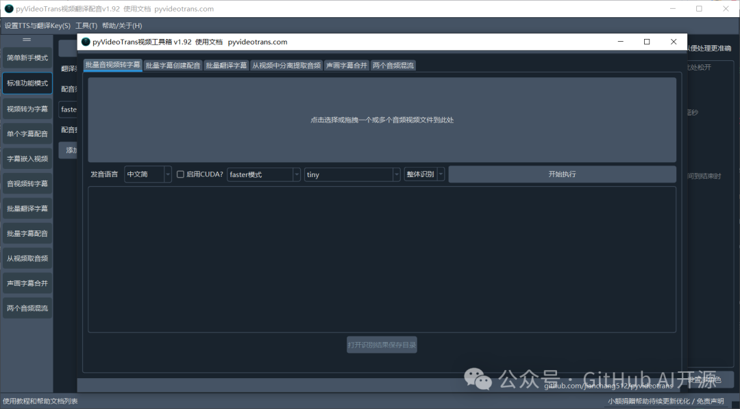 打开软件,可以看到 pyvideotrans 具有丰富的菜单栏。