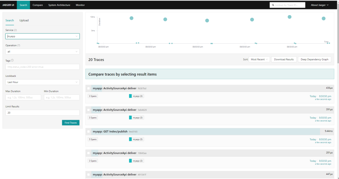 启动服务后,进行发布、消费,链路追踪信息会被自动推送到 OpenTelemetry Collector 中,通过 Jaeger 、Skywalking 等组件可以读取出来。