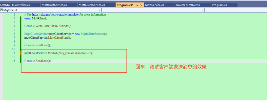 26、客户端 program 类里面,客户端连接以后,通过手动回车,来执行客户端发布消息。