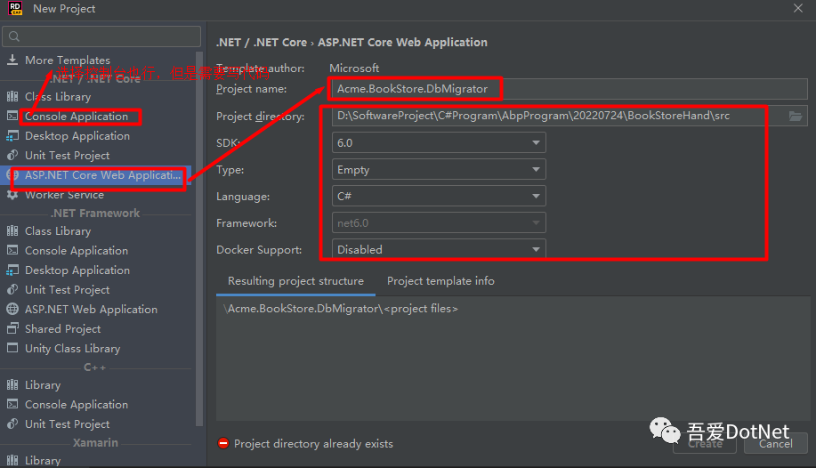 Acme.BookStore.DbMigrator 是控制台应用程序,主要是迁移数据库结构并初始化种子数据。通过 Rider 创建 ASP.NET Core Web Application 的 Empty 项目 Acme.BookStore.DbMigrator 如下: