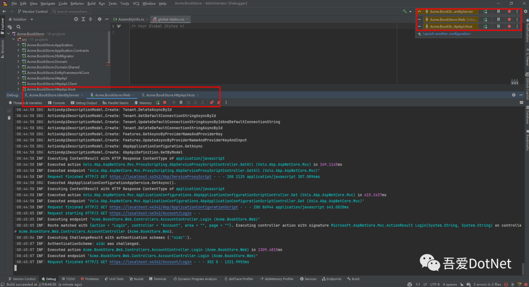 发现消息提示说 ABP CLI 有个更新的 5.3.3 版本,通过命令 dotnet tool update -g Volo.Abp.Cli 进行升级。再次运行 Acme.BookStore.IdentityServer 项目,发现不报错误了。如果在启动其它项目(特指 Acme.BookStore.Web 项目)的时候报同样的错误,那么同样执行命令 abp install-libs 即可解决问题。同时启动这 3 个项目如下: